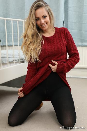 Suzi in Only Opaques set Red Minidress Heels Black Pantyhose